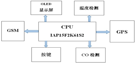 根据方案论证,如图1所示本设计由CPU、按键部分、OLED显示模块、温度检测模块、CO检测模块、全球定位系统(GPS),全球移动通信系统(GSM)组成。