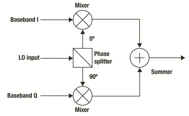 宽带宽无线发射器常用模拟正交调制器(AQM)把复合(I + j*Q)基带信号转换为射频(RF)。AQM内含一个本机振荡器(LO)输入、一个生成两个LO 90度异相的分相器、两个混频器(每个混频器将基带信号混频为射频)以及一个组合两个信号的加法器(图1)。