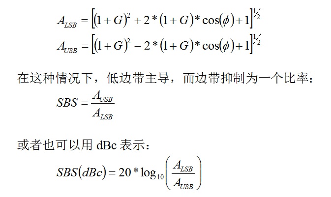 增益和相位误差会导致无用混频器抵销不完全的结果—剩余量称作边带抑制(SBS)。上下边带振幅以基带Q输入的增益误差G和I分支混频器LO的相位误差(弧度)作为开始,其为:
